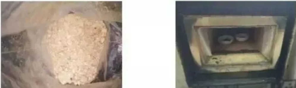 調研過多家醫(yī)藥化工企業(yè)RTO爐,發(fā)現(xiàn)大部分企業(yè)RTO爐在運行一段時間后,蓄熱床層底部有二次污染物大量積聚(如圖2)、黏附現(xiàn)象,易造成蓄熱床層底部堵塞,引發(fā)火災等安全事故。以某醫(yī)藥企業(yè)為例,經過取樣試驗分析發(fā)現(xiàn),該二次污染物具有以下特性:
